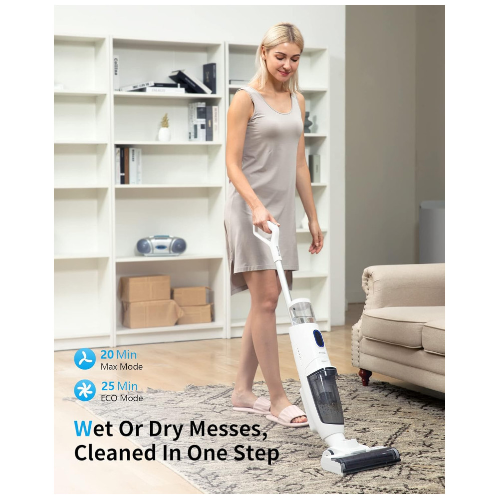 Autolimpeza e Assistência por Voz: Com a função de autolimpeza de 60 segundos, este aspirador e esfregão a seco e molhado limpa automaticamente a escova do rolo e libera suas mãos.