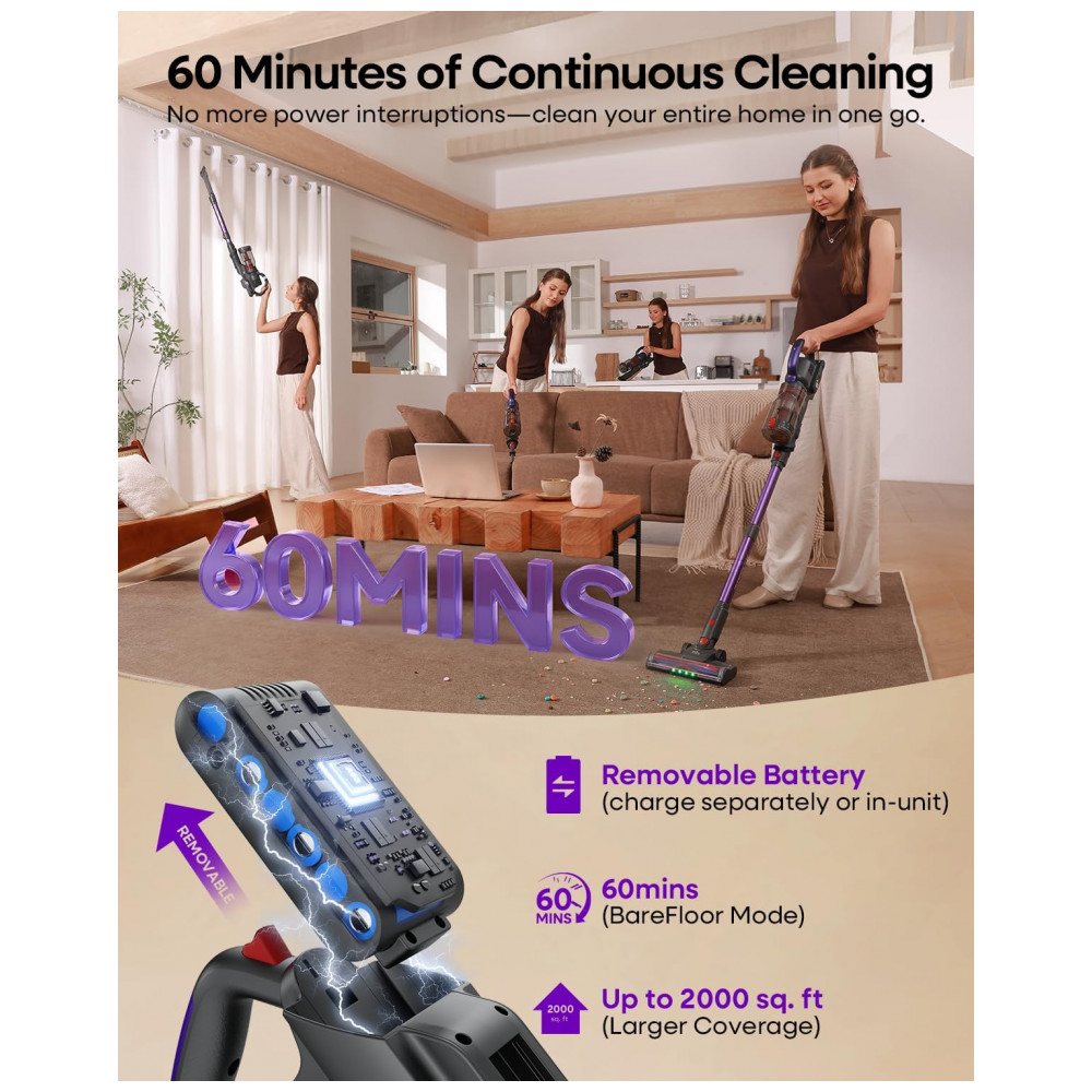Aspirador de Pó Sem Fio AlloyMove 45KPA, Até 60 Minutos de Autonomia, Sucção Poderosa para Casa, 3 Modos de Sucção,