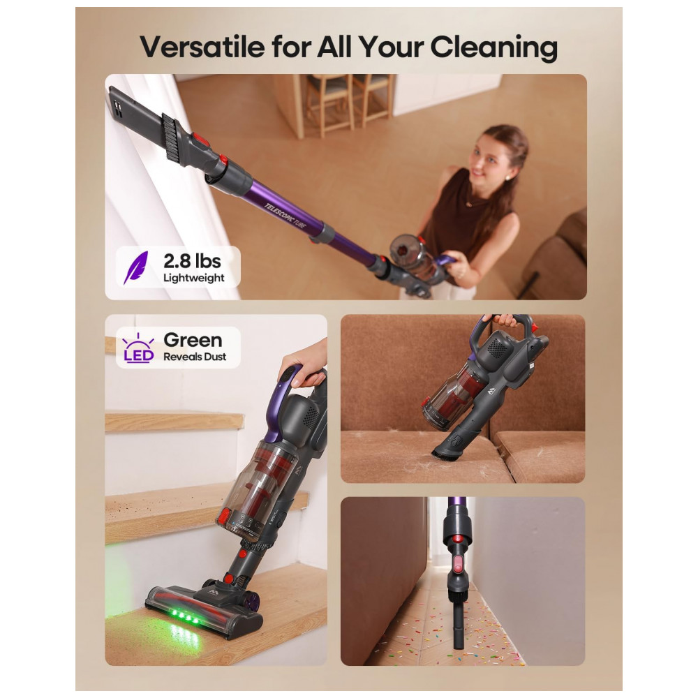 Este aspirador enfrenta facilmente a poeira profunda do chão, detritos teimosos de tapetes e pelos de animais escondidos.