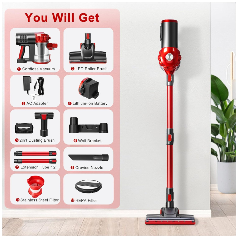 , Formato Manual e Bastão, Cor Vermelho, Nome do Modelo Aspirador Sem Fio A200, Dimensões do Produto 27cm x 14cm x 119cm, Descrição da Bateria Íon de Lítio, Nível de Ruído 75 dB, Vida Útil da Bateria 38 minutos, Fabricante elezon, Número de Itens 1, Tipo de Controle Botão de Pressão, Potência do Motor 150 Watts, Método de Controle Toque, Estilo Moderno, Número de Velocidades 2, Portátil Sim, Número de Níveis de Potência 2, Número da Série 200, Uso Interno Externo Interno, Peso do Item 3 kg, Número do Modelo A200, Baterias 1 bateria de íon de lítio necessária inclusa , Instruções Específicas de Uso O aspirador sem fio A200 atende a uma variedade de necessidades de limpeza doméstica, desde escadas e parapeitos de janelas, sofás e camas, mesas e cortinas.